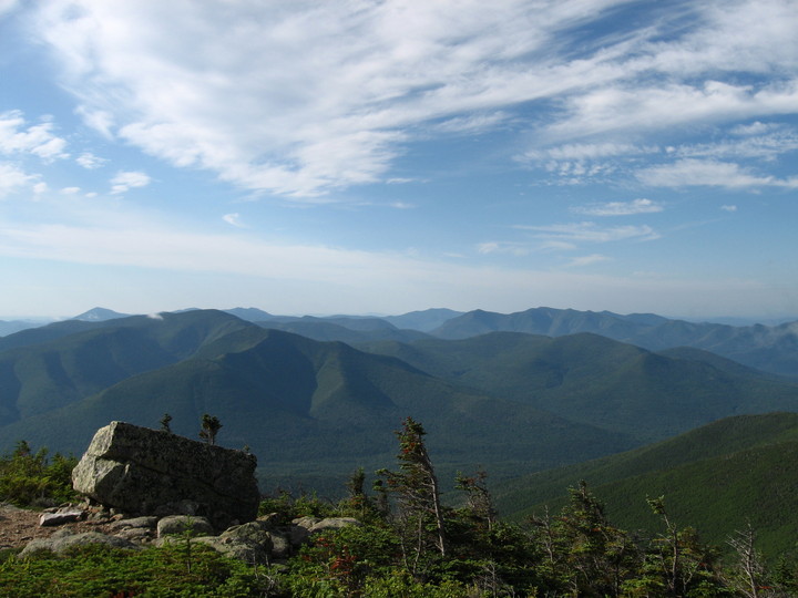Mt. BondThe last day's hike was 11 miles over Mt. Bond and Bondcliff. We didn't know where the good views would be. We traversed a long, flat ridge of Bond, all wooded with no views, not knowing where the summit was. But when we reached the summit we let out a whoop and then were speechless for 5 minutes at the awewsome views and beautiful weather.